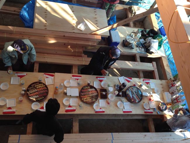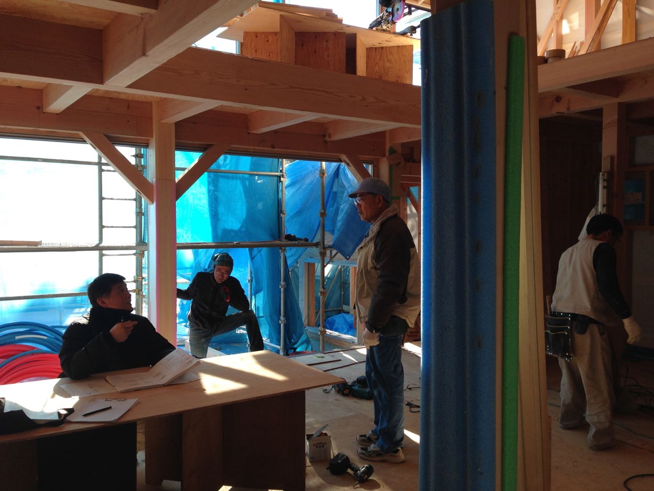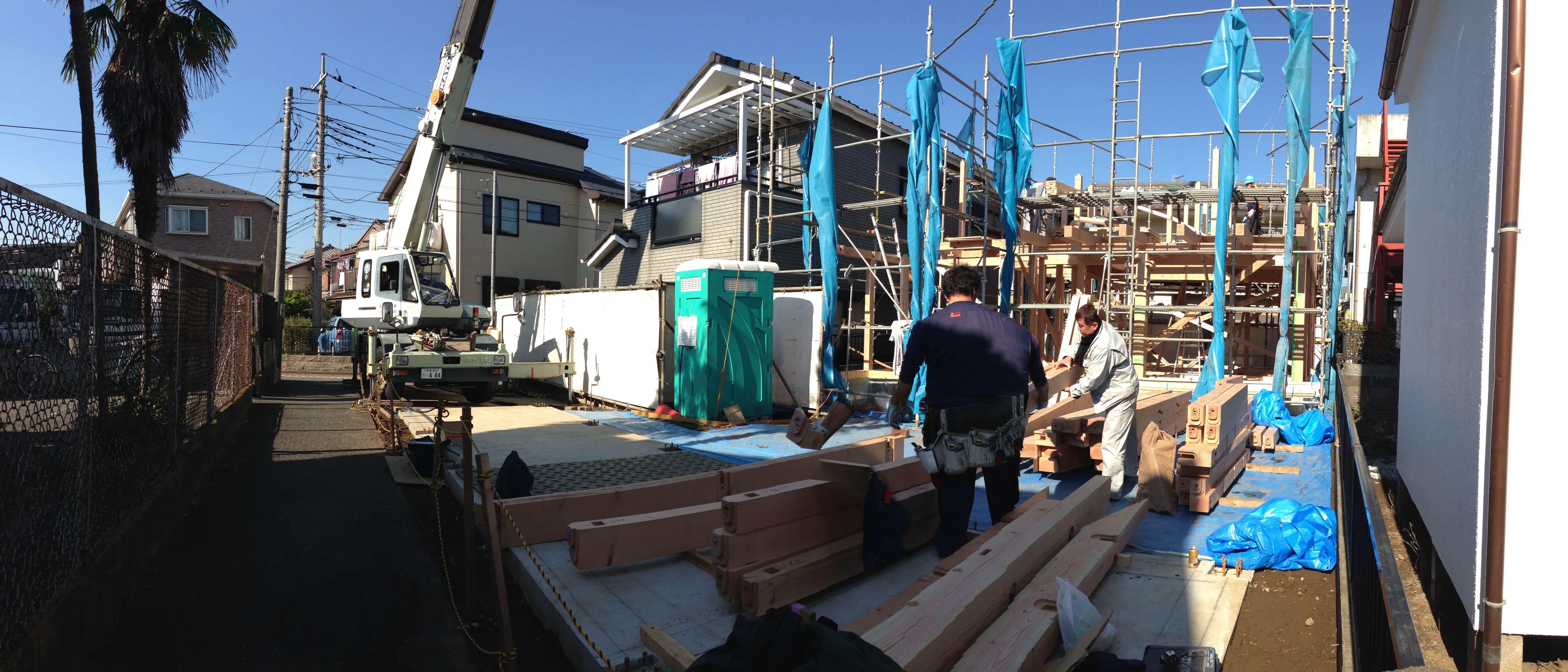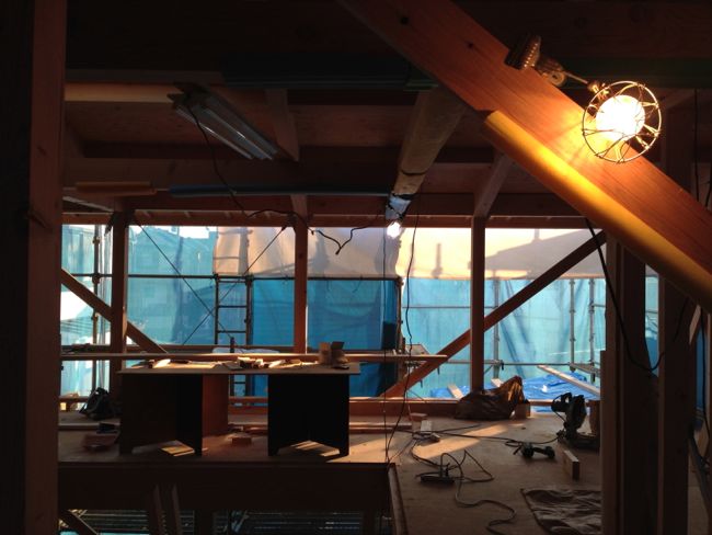 写真はiPhoneのパノラマを気に入ったので2階の風景を。職人さんは誰もいないようですが、よーく見ると一人居ます。