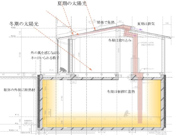 天気のよい冬期は窓から室内へ太陽熱を取り込むことに加え屋根で集熱をし、その熱を蓄熱をする。時間/季節による熱の平衡化を意図しました。