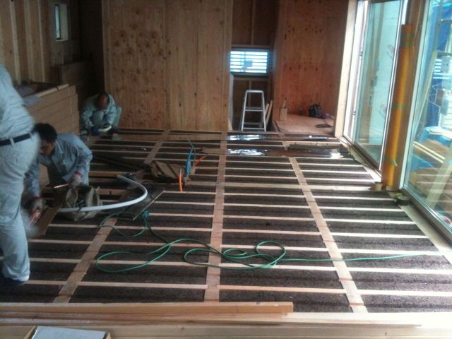 写真は床暖房。黒く見えているのは炭化コルク。断熱材です。