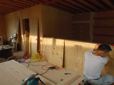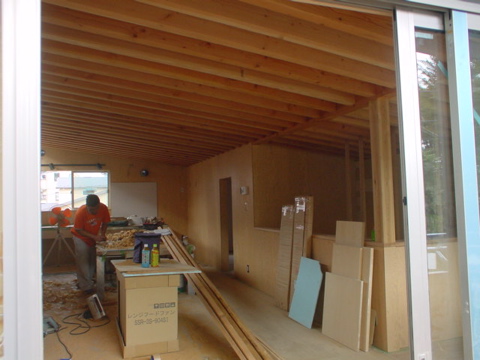 大工工事ももう少し。内部の壁はあとラーチ合板を張れば終わります。