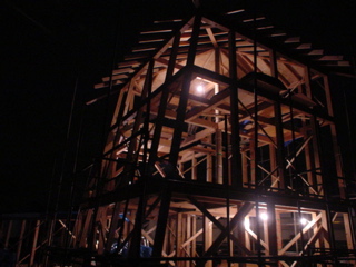 帰り際、照明に照らされる軸組。やはり木造はこの軸組段階が一番きれい。でも住めないんだよね、この状態じゃ。残念。