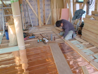 写真は床材を張っている「なべさん」と写真の色見が気に入ったから。一応1階の床。