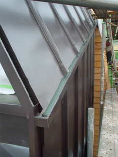 写真は「これ大宝さん(板金屋さん)大変だよ」と花輪さんが言っていた納まり。向こうに少し木の壁が見えます。